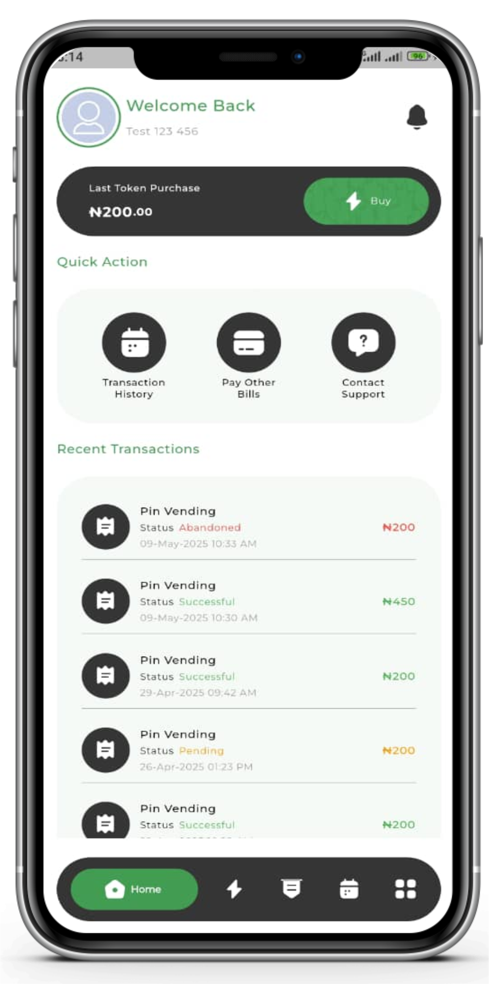 Android and iOS mobile apps for end customers to purchase tokens, pay other facility charges, view transaction history, log complaints, and update personal information.